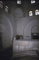 The two-storied zone of transition and the dome of the tomb are conventional in form and have obviously been restored; the original details are no longer preserved. The dome is gored, in brick, and the zone of transition above is set well back from the cornice. On the interior, the zone of transition is set above split pendentives, and a twelve- and then twenty-four-sided brick zone of transition to a brick dome. The combination of split pendentives, unusual in Damascus, and brick zone of transition, at a time stone had already been used for this element, are a puzzling mix. Perhaps the architect of the facade and tomb, having included an unusual element, left it at that, and had the specialists in brick vaulting complete the vault in a single build. The effect is to create a more unified, enclosing space. The twelve (rather than the more usual eight or sixteen) arches in the zone of transition march smoothly around the base of the dome, keyed to the forms below but contrasting with their alternation of forms. These same features are seen again in the tomb of the Madrasah al-Qilîjîyah.
