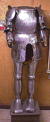 Full suit of armor without helmet, Maximilian style, with wooden stand.