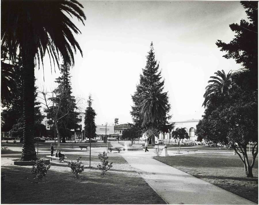 In 1960 the winds of civic improvement and modernization once again swept through Healdsburg. At the same time that a new City Hall and fire station were underway, attention turned to the Plaza. A landscape planner, Burton Litton of Berkeley, was hired in that year to rethink the park. His plan, along with the older Canary Island Date Palms and redwoods, are what we now see in the center of town.