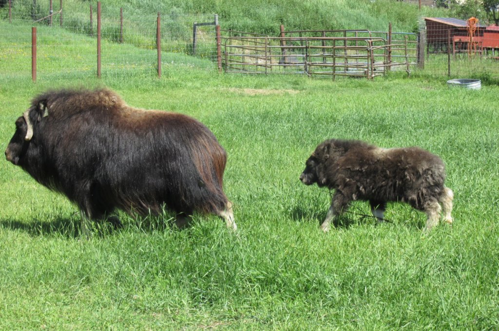 Pictured is a baby musk ox following its mother.