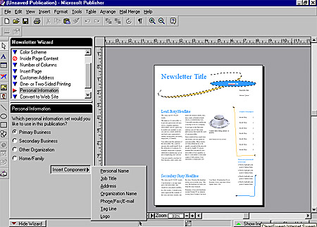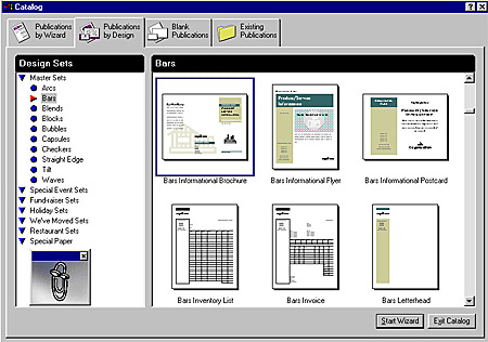 used in Word; multilevel undo; the same toolbars; and an animated assistant that some people love to hate. Intermediate users should appreciate its Web features. What about advanced users? I don't know about all advanced users, but I can relate how I use the program. Have you ever ever had that desktop publishing job that the client wanted like yesterday; you didn't have time for the job; you didn't want to start from scratch to design it in Photoshop or Pagemaker; you didn't want to sort through all your CDs for the right graphics and fonts; the client didn't know what they wanted, exactly; you didn't know either and therefore had difficulty starting the project; it wasn't a job that demanded the detail or expertise that you would want for Vogue Magazine; and you had computer block: you just sat there and stared at a blank screen. Well, that happened to me recently. All the information I had was that they wanted a flyer that was cute and cuddly for a home nursery for babies; I thought about Microsoft Publisher. I used a predesigned publication and the wizard to get me started. I then went in and made changes to certain features. There were enough graphics available in Publisher that I had no problem finding cute and cuddly images. I started to enjoy the job. I was happy with the finished product and so was the client. I find Publisher also useful for clients who have small jobs; little money; want inexpensive color documents; and want to use predesigned paper such as from Paper Direct. Publisher includes a variety of predesigned documents using paper from Paper Direct that help you produce professional looking color documents in no time that can then be inexpensively xeroxed. |