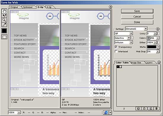 Object-based and Manual Slices--Illustrator 10 also includes another Web-based option that has been popular in programs such as ImageReady or Fireworks: the ability to slice your images. You can create object-based slices or manual slices. Object-based slices update automatically as you edit or reposition elements. Manual slices, created with Adobe-standard slicing tools, don't update automatically, but make it possible to dissect a single object into multiple slices or to create slices that aren't tied to a specific object or group. Different format and compression options can be applied to each slice to optimize the size and image quality of every element in an HTML table. Raster and vector formats can also be mixed within a single table. See images to the left for view of slices and Save for Web options where you can select different format and compression options for each slice. Support for Cascading Style Sheet Layers--Illustrator 10 also includes support for CSS (Cascading Style Sheet) layers, which allow you to create transparent overlapping slices or to selectively control which layers are visible when your Web page is seen in a browser. CSS layers build on the top-level layers you use to create your Illustrator drawing. You might want to have a Web page with a logo overlapping a background image, but you don't want the logo and background in the same slice. You could assign the logo to one layer and the background image to another and then export the file using CSS layers, and the logo slice would have a transparent background. This makes it easy to update either the background or the logo without affecting the other component. CSS layers are also a convenient way to hide or reveal elements in different contexts. For example, you could design multiple language versions of a site simply by creating a navigation bar that might use a different layer for each set of localized buttons for English and French-speaking audiences. When you export the file using CSS layers, you could make the layer that matches the user's browser visible and hide all others. Then users in Paris would see the French-language buttons while those in London and New York would see the English version. Illustrator 10 does not allow you to create JavaScript rollovers or GIF animations, so you still have to export your file to another program for these features. Yet if you import an Photoshop 6 file that includes rollovers or animations, you can preserve them by using CSS layers. You simply place the file on its own top-level layer; when you export the file using CSS layers, the resulting HTML page will include any rollovers and animated elements included in the Photoshop file. See images to the left for view of CSS layer options and HTML table options. |