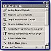 | For those of you who have had the experience of choosing all the settings you need for a tool, then changing them later to work on a different project, and then wondering what you're missing as you try to find the settings that made that tool perfect for the preceding job, Photoshop 7.0 offers you an excellent solution: Tool Presets. You can create Tool Presets, establishing settings for individual tools so you don't need to keep adjusting options each time you return to a tool. The Tool Presets palette makes it easy to name, save, and apply presets for any tool in the toolbox. For example, you can choose default fonts, point sizes, and text colors for the Text tool, choose specific brush settings for the Eraser, and set up the way the Gradient tool will work automatically. Any tool in the toolbox can be customized and the custom settings saved. You can create multiple settings for individual tools (and for each version of each tool), again making it possible to customize your environment so it's quick and easy to set up for specific projects or projects of a particular type. Besides the Tool Presets palette, which you can bring up and down like a regular palette from the Window menu, there is also a click, drag and select version of the palette available at the top left of the Options bar. Once you start creating these presets, you will wonder how you functioned without them. This is a welcome addition to Photoshop. See image to the left for a view of the Tool Presets palette. |