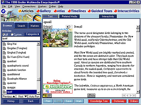 Grolier Interactive's 1999 Deluxe Edition Encyclopedia is a comprehensive multimedia encyclopedia. The company has a 100+ year history in encyclopedia publishing. The encyclopedia has won a variety of awards and is widely used in both schools and libraries. It comes on two CDs packed with hundreds of graphics, sound and video features, Internet links, organized presentations, and fact-filled articles, 20% more than the printed edition. Your knowledge is never out of date with this package. Grolier Internet Index offers 22,000 links to World Wide Web sites and the Article Updates provide about 500 revisions each month. You also have access to two other encyclopedias online. Thus Grolier's provides a fast and easy way to tap the full potential of online research. Price: $59.99. You can check out Grolier's website for other CD titles such as 1999 Grolier Multimedia Reference Suite CD-ROM Edition, ELLE Beauty Guide and Picasso: the Man, his Works, the Legend. Grolier Interactive: http://www.grolier.com