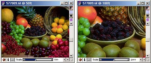 | The new continuous and variable zoom feature replaces the earlier integer-based zoom that was restricted to a set of specific zoom factors. The new zoom technology includes two key features: a scale slider that lets you zoom in and out of you image in a single, continuous motion, and an editable text box that lets you input an exact zoom factor. See graphic to the left for a view of an image at 100% and at 50%. You can see the slider on the bottom. | |