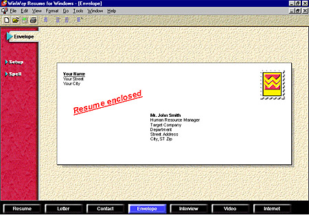 Envelope--You can print an envelope directly from your contact list or from the envelope button. Endorsements such as "Resume Enclosed," "Urgent," or "Rush" can be added. You can even add your own worded endorsement.