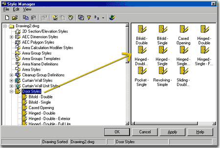 The Style Manager System works on the principal of object families and can be accessed through numerous paths: on the Object Family Level ( illustrated to the right ), on the Object Style Level ( such as a Door Style ) and on the Object Entity Level ( such as a single Door Object ). The Style Manager Window, illustrated to the right, provides direct access to all of the families and thus also provides a full overview of all the objects that are currently defined in Architectural Desktop. At first glance you may be surprised to discover that there really are not that many families. In the case of Doors, for example, you can have nearly an unlimited number of Styles. These Styles are all based on a hard-coded set of Door Types that range from Single to Revolving. Each Type can be customized in many pre-defined ways and you can even use custom shapes ( called Profiles ). The full Door Family (Object Family Level ) can be controlled at the Style Level (Global) as long as no Style Member has Overrides Attached to them. In most cases, you will find it just about impossible to not use Style Overrides so the likelihood of managing Style Families on a Global Level is rather low. These changes, if possible, only apply to the Display Properties and not to physical dimensions or proportions which can only be managed on the Style Level. A Door Style ( Object Style Level ), however, is far easier to manage on a Global Level much like a set of Blocks with the same name. This means that if you intend to have something Interior and Exterior Doors, you should plan on having at least two Style for this function. Exterior Doors can then be controlled through one Style and you can achieve such display changes as Threshold dimensions for all Exterior Doors just by working with one Style. Given that the other two control methods only affect a portion of a Style, the Display Properties, this is the most effective and normal way to work with Objects. A Door Object ( Object Entity Level ) can also be controlled, to some degree, on an individual level by use of Display Property Overrides and though this can be a fantastic option, it can also be a managerial nightmare because once an Override has been executed at this level, there is no way to change it on a higher level. These changes only apply to the Display Properties and not to physical dimensions and proportions which can only be managed on the Style Level. |