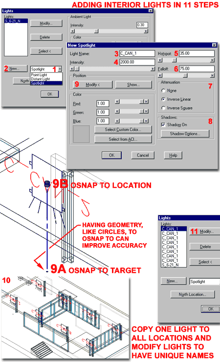 If you decide that you also plan to create some Interior Renderings or just want the appearance of Lights inside your Model, you can use Spotlights to resemble the effect of a ceiling can. Illustrated to the right, I show on the Lights dialogue box that I have set the Light Type to Spotlight before using the New... button to access the New Spotlight dialogue box. On the New Spotlight dialogue box, I show that I have provided my Spotlight with a Light Name ( C_CAN_1 ), an Intensity, a Hotspot Angle, a Falloff Angle, Inverse Linear Attenuation, Ray Traced Shadows and a Position ( Modify button ). One of the more difficult tasks required with Spotlights is that of providing a Target position and Location position. These two points in 3D Space are very important because they work together with the Hotspot, Falloff and Attenuation settings to create a lighting effect. Depending on how they are set, Spotlights can be thought of as 3D Cones and thus the Height becomes a factor in the base diameter. To make the task of Positioning a Spotlight easier and more accurate, I often use circles drawn in the exact locations of the Target and Location so I can use the Center Osnap to get those points quickly.