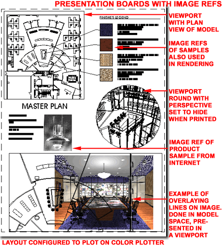The Image Reference Manager can become just as useful and powerful as the External Reference Manager and the savvy designer will utilize both to the fullest in order to create the most dynamic and creative presentations. Illustrated to the right is an example of how Images and Vector drawings can be mixed in AutoCAD and Architectural Desktop to create the types of presentation boards usually assembled by graphic designers with Photoshop, Illustrator, Quark Xpress and other similar graphic programs. Though there are significant limitations to creating presentation work in a Vector program, there are also opportunities. One of the most rewarding aspects of creating the presentation material in the CAD program used to create the Renderings, is that it is far easier to keep the floor plans, elevations and other linework up to date in the design process. By working in AutoCAD and Architectural Desktop, you can use Image Refs and Xref's to allow for rapid updating of information. As with Xref's, the Image Refs point to a source raster file and thus whenever that file is changed, so to the image on the presentation drawing. |