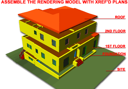 Though Architectural Desktop has limited support for Xref's and may not be the best solution for your particular Modeling and Rendering needs, using Xref's in the Rendering and Presentation phase of a job cycle can be highly advantageous. With Rendering Template Files you can produce presentation quality Renderings almost immediately after assembling the Xref's. Using multiple copies of the same Xref'd Rendering drawing, you can manage multiple Rendering conditions to produce very different images such as Sections, Elevations, Interiors, with surrounding structures and versions with different materials. |