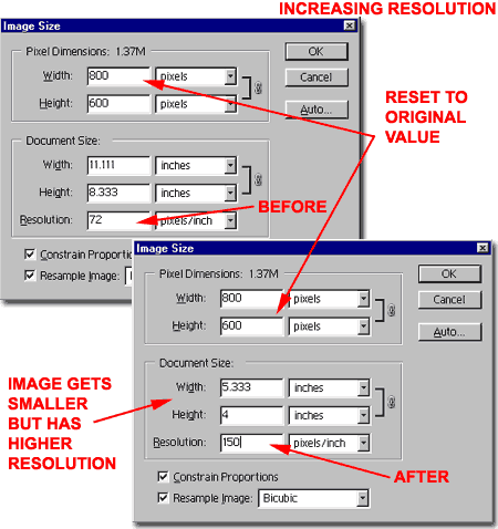Photoshop offers an amazing assortment of sophisticated tools to control the look and quality of raster work so this is usually the best tool to use after creating presentation work in AutoCAD or Architectural Desktop. When images are opened in Photoshop, they are usually assigned a default resolution of 72 pixels per inch which is pretty good for the web but rather poor for general printing. This will explain why images rendered at resolutions of 3000 x 3000 pixels or so will appear enormous when opened in photoshop and viewed at 100% magnification. To get higher quality prints from Photoshop, you will need to increase the resolution in pixels per inch while maintaining the original pixel data. In other words, you cannot simply change the pixels per inch and expect new pixels to be added where they were never accounted for. In order to maintain the original pixel data while increasing the resolution, you must reset either the Document Size or Pixel Dimensions to their original values. The result of this change will reduce the image dimensions to a much smaller size than when it was first opened in Photoshop but the quality will be much more refined. Though you can use a formula for calculating the best quallity output for your printer, you should expect that 150 pixels per inch and up will produce rather impressive results. |