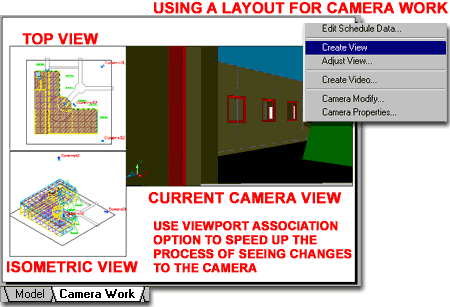 Cameras in Layouts To take advantage of the Viewport Association option on the Add Camera dialogue box, you can set up a Camera Work Layout as illustrated to the right. By using two or more Viewports, you can work with the Camera in one Viewport while seeing the results in another Viewport. This technique is very similar to what can be accomplished in Viz but unlike Viz, Architectural Desktop's Camera will not generate the perspective automatically. To see the latest results of Camera changes, you have to Select the Camera object, right-click and select the Create View option on the object specific pop-up menu ( see image, right ). If the Camera has been Associated with a Viewport, the Create View option will automatically generate the view in the appropriate Viewport. If no Association has been made, you will be requested to Select the Viewport in which to generate the Camera View. |