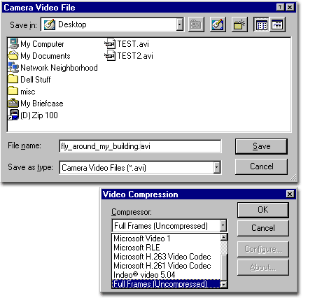 | Saving a Movie in .avi format and Compressing it. When you hit the okay button on the Create Video dialogue box, illustrated above, you will be prompted for the file name and location - unless you requested a "Dry Run". There is only one type of output so there is no decision to be made about the type of file; just the name. AVI files are the most common movie files so most people can read them - from Mac to PC. After choosing a name and location, you will be requested to choose a Video Compression method. If you have absolutely no idea of what to do here, use the Full Frames (Uncompressed) method illustrated below right. Compression methods are designed to help make enormous .avi files a little more acceptable for storage or transferring to other systems. One goal for a lot of architects is to communicate with a client about a conceptual design so an .avi file may need to be sent via e-mail or posted to a project website. Choosing the right or best Compression method can be a bit tricky. Each method uses different solutions and some offer the option to set Configuration parameters to help fine-tune the process. Cinepak Codec by Radius offers the ability to turn the movie into a black-n-white movie, for example. A safe choice is a Microsoft method simply because most people have some form of a Microsoft Media Player. Microsoft Video 1 is an older method so if you suspect your audience has an older system, that may be a good choice. Otherwise, I use the Cinepak Codec by Radius method and make some trials to see how compressed the quality can be without looking too bad. Keep in mind that the size, in pixels, of the movie has a lot to do with final file size and quality. |