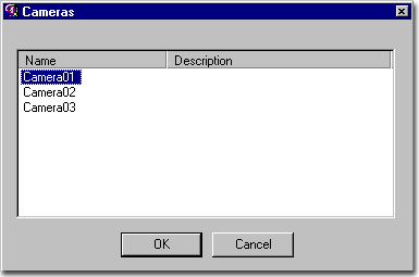 You can use this command to select an existing Camera object and automatically generate the Perspective that Camera is set for. You can also use this command to switch between existing cameras, as illustrated to the right. When you are requested to "Select a Camera", you can hit the Enter key and the Cameras list dialogue box will pop up allowing you to select from the named list. |