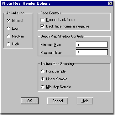 | "Photo Real" Render Options dialogue box Illustrated to the right is the Render Options dialogue box acquired from the More Options... button on the Render dialogue box for the Render Type "Render". Anti-Aliasing - a process in which efforts