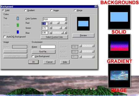 Using the Background dialogue box should prove to be one of the easiest things you can do to dramatically affect a Rendering. Through this dialogue box, you can set the background to render as a simple monotone color, a custom gradient color, a custom bitmap image or a working screen merger. In addition to controlling how the background looks in renderings, you can also add a reflection background with the Environment option so that reflective materials reflect exactly what you want; even if it's something completely different than what is in the current drawing. |