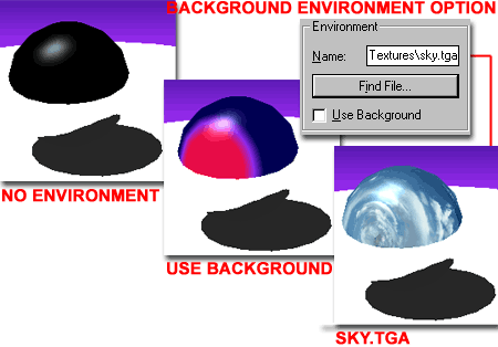 The Environment option that is available for all of the Background types, offers the ability to control a component of what Reflective Materials reflect. These are Materials that use the Mirror Attribute option and not a bitmap image for their reflective Color. By setting a bitmap image file and path in the Name text field ( use the Find File... button ), this image can be used exclusively for objects with Materials that have a Reflective Attribute Value. By using this feature, you can add more "life" to some objects while keeping a simple Background.