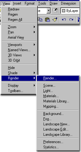 | Render pull-down menu Illustrated to the right, I show the Render pull-down menu which consists of all the same tools as those found on the Render toolbar. In this Part we will be discussing three tools for adding simple environmental effects to your Renderings. These effects include Background colors and images, Fog and Landscape "image-objects". Backgrounds are one of the easiest ways to add graphic atmosphere to a Rendering and you can use Backgrounds to affect Materials that have a Reflective Attribute value. Backgrounds will also help to lighten Renderings that appear dark. Fog is the closet to an actual atmosphere control and can be used to create a the illusion of actual Fog or as a tool to fade back areas with little to no detail. Landscape objects are the most complicated in this discussion but offer one of the most exciting and fast ways to drop clip-art objects into a Rendering to assist in adding "real-life" elements such as Cars, Trees and People to 3D architectural geometry. In this discussion, you will also learn how to make your own Landscape objects to take even greater advantage of this simple trick to make Renderings look more realistic. |