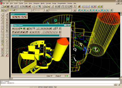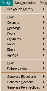 components that make a building a building: Walls, Doors, Windows, Stairs, Roofs, etc. The commands within this Design category are both impressive and disappointing: Stairs, for example, are impressive by virtue of being easy to understand, adjust and implement but disappointing by virtue of design limitations (a variable tread width from floor to floor is not possible at this time so don't expect to make an elliptic winder just yet). Some of the other commands, like Roofs, have a Convert to Roof... option which may be the future solution for handling unique Stairs. Elevations and Sections are generated automatically by replicating the 3D model and then aligning it to a Paperspace viewport for the proper viewing angle. Changes that are made to the "parent" model are automatically reflected in the Elevations and Sections. |