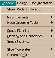implementing it. The Concept category works on the principle of creating a design by Massing, Spaces, Boundaries or a combination of all three; one can create a Massing study and then easily convert the Masses into Spaces and/or proceed to the Generation of Walls. |