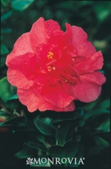 A versatile performer displaying a profusion of striking, scarlet peony form blooms. Flowers are perfect for cutting. Spreading form makes this an excellent choice for a colorful low hedge, espalier, or tall groundcover. The glossy, dark green foliage makes an exceptional foundation planting in sheltered sites with bright shade. Early season bloomer. Evergreen
