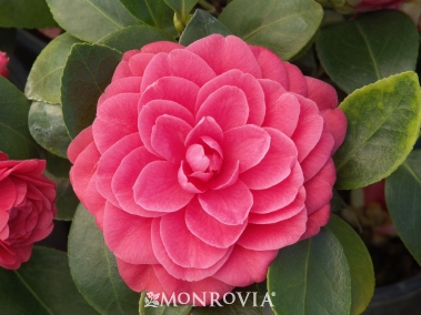 Spectacular, deep red, formal double blooms are displayed against glossy, dark green foliage. Colorful accent for the shade. A prized plant of the milder regions of the U.S. Mid to late season bloomer. Evergreen.