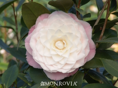 Spectacular, fully double blooms with pure white petals edged with an orchid pink blush. Flowers make a dazzling contrast with the glossy, dark green foliage. Add an elegant, formal appearance to your garden! Mid season bloomer. Evergreen.