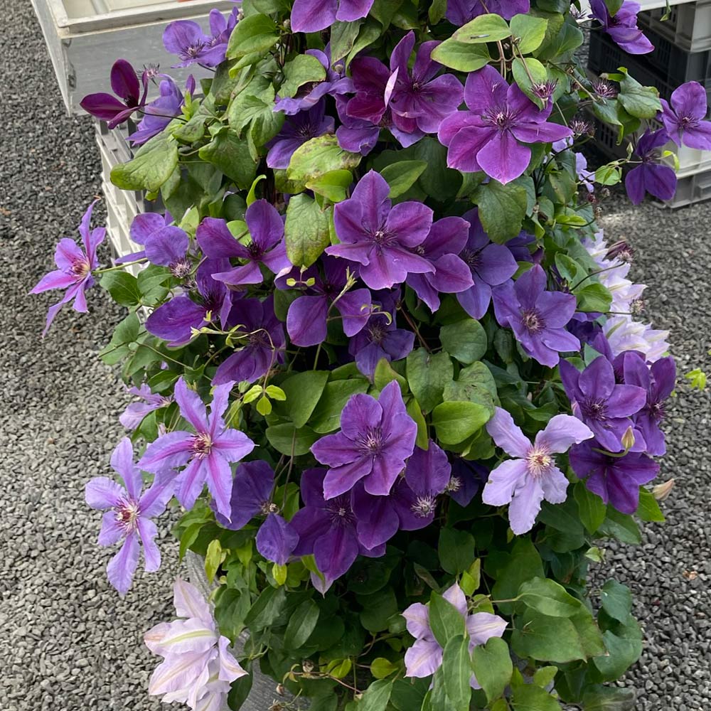 A floriferous array of luxurious, deep purple flowers with streaks of magenta down the length of each petal cover the compact, vigorous foliage over a long flowering period. These stunning perennial vines are easy to grow and incredibly rewarding, and their compact habit makes them a perfect choice for adding height to a container or planter box, filling in lush greenery in a covered porch or patio, or covering a low fence or garden art in the landscape. These beauties can even be used in a hanging basket!