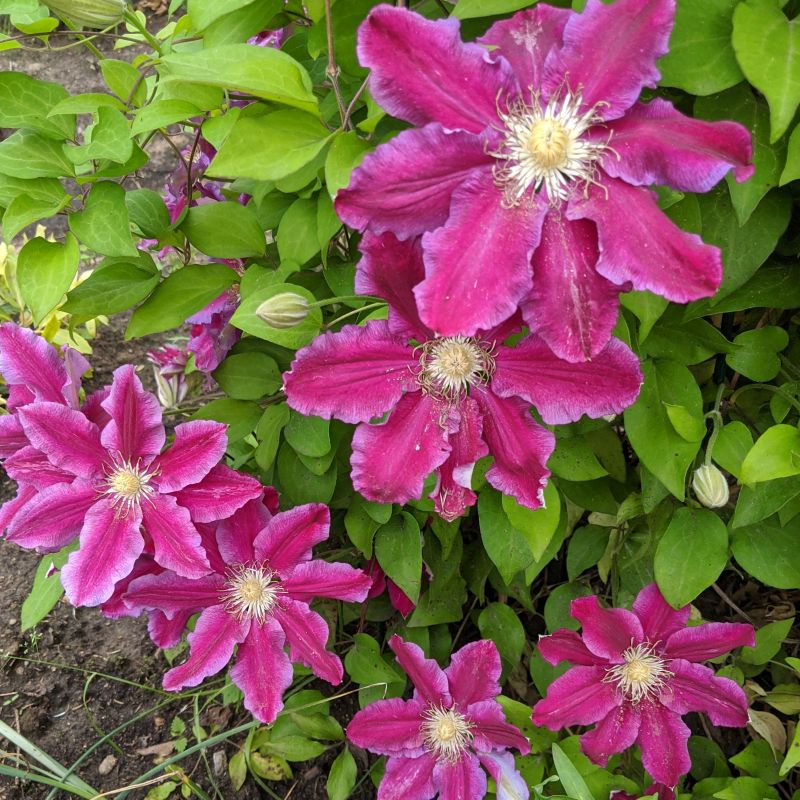 A vivid, large flowering repeat bloomer with eye catching color and texture. Long petals (the flowers can reach 5-7" across!) taper to a point, with wavy, ruffly margins giving a fun, playful shape to the bloom. Vivid, deep pink petals fade to a dusty lavender rose at the margins, centering around a set of fluffy ivory anthers. Vigorous, low maintenance, compact foliage is perfect for containers, patios, low fencing, or in a shady landscape. Pruning: In late January/early February, cut to 6-8” from ground level to a pair of buds. Then cut by half after the first flush of blooms is finished. Feed after each pruning session with well-balanced fertilizer.
