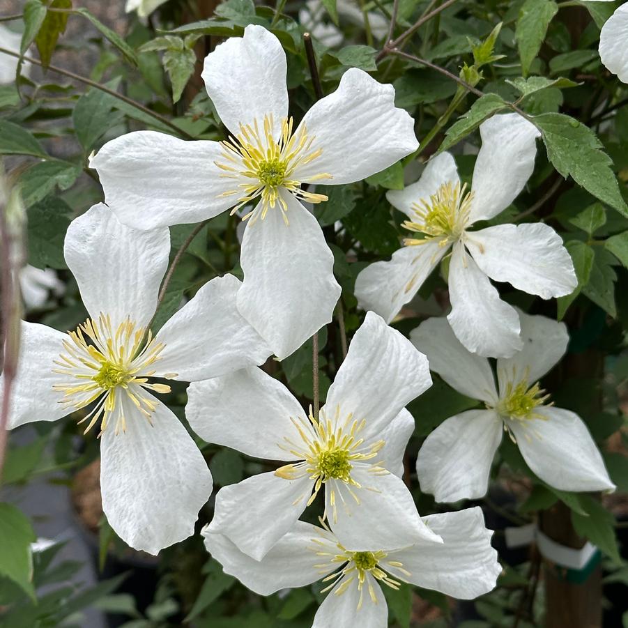 A member of the Montana group (otherwise known as an Anemone Clematis), this hardy, quick-growing, vigorous climber is a winner of the Award of Garden Merit from the Royal Horticultural Society. Hundreds of petite, snow white, four petaled flowers, each only reaching around 3" across, bloom so prolifically that they can fully cover the deep green foliage, releasing a gentle, sweet fragrance from their golden anthers. Despite the diminutive size of the flowers, this powerhouse can grow absolutely massive if left to its own devices. No need for regular pruning to keep the blooms coming; just clean up once the flowers are done.