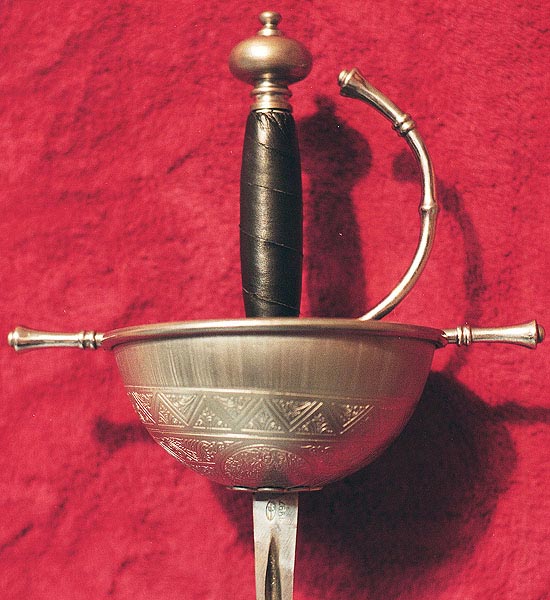 Spanish Cup Hilt ~ 361SFittings are Steel Quillion: 8" Hilt: 7 3/4" Handle: 3 1/2" (Shown with Epee blade) NOTE: All weapons are made by hand and some individual differences may occur. We reserve the right to make substitutions of individual parts as dictated by stock on hand. |
