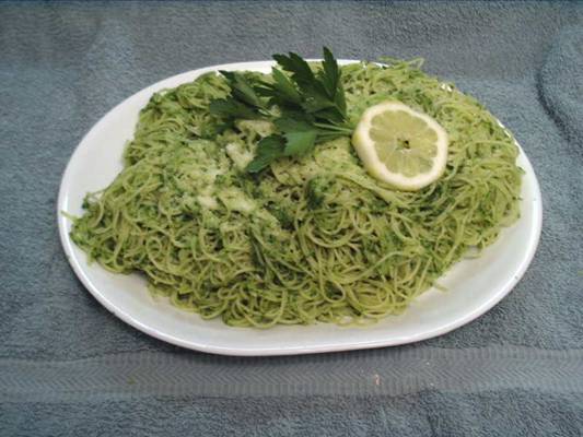 Makes enough sauce for 1 pound of cooked pasta. This pesto has a milder taste than traditional pesto. It is a good alternative for people like rick ... Less garlic and no basil. -betty