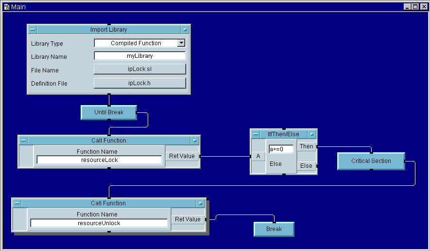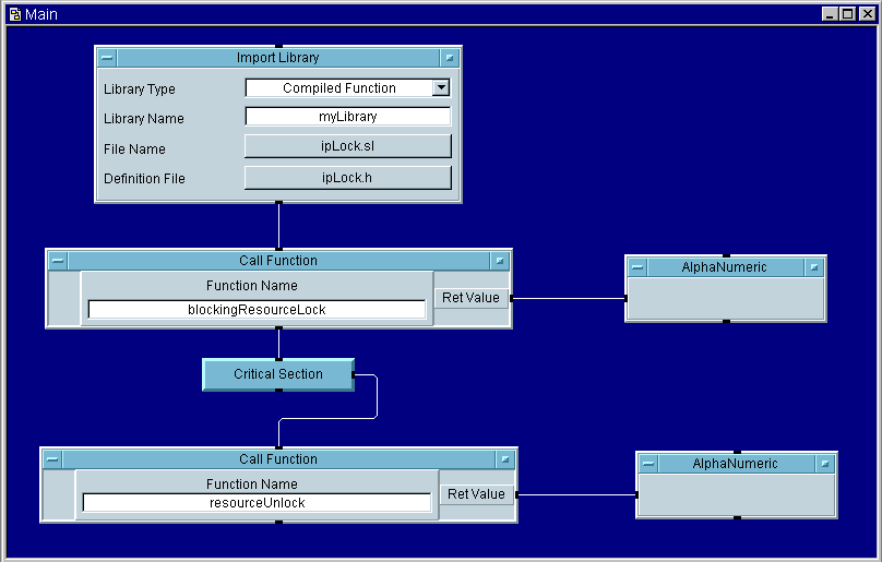 This Compiled Function will set a lock to gain exclusive access to a resource. After having used this function and having been granted exclusive access to a resource, no other entity (here we assume that the other entity also uses these locking mechanisms to request access to a resource) may gain access to the resource until the locking party calls the corresponding unlocking function. This call will block indefinitely if some other entity has a resource locked. Note that it is not necessary to specifically create any of the counting semaphores these compiled functions use. If they do not exist, the Compiled Functions will create them. If this function succeeds, you need to follow it with a balancing call to resourceUnlock. The following illustration demonstrates the use of this function.