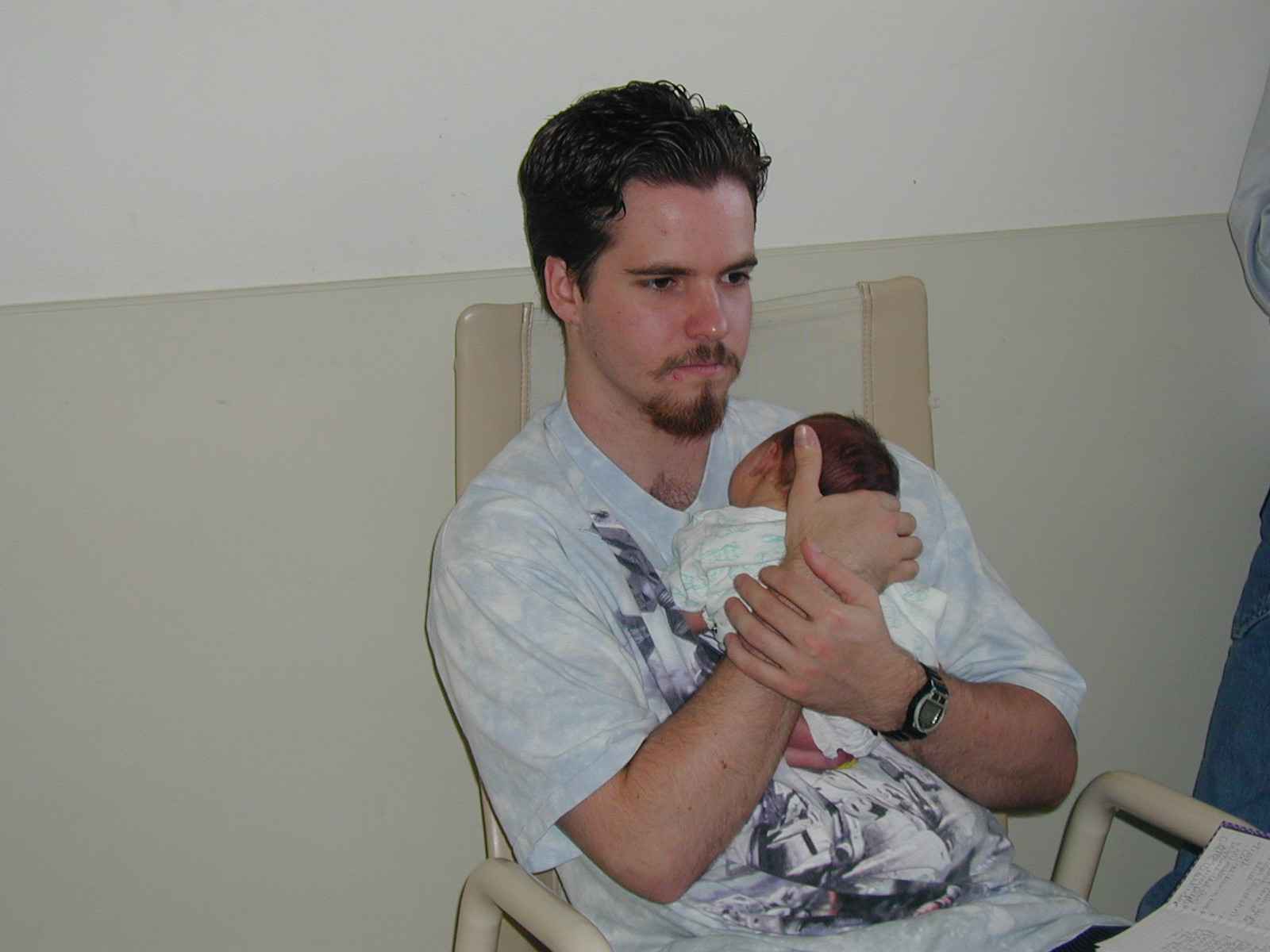 Here's one of daddy holding me. He's still not sure about this, but he'll get into it. I'm just too cute! More pics of me!