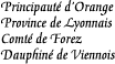 [Arms for the Principality of Orange] [Arms for the Province of Lyonnais] [Arms for the Countship of Forez] [Arms for the Dauphine of Viennois] [Principality of Orange