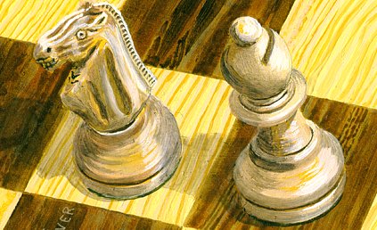 This problem is attributed to former WWII tank commando Karol Wojtyla, nephew of famed Polish problem composer M. Wröbel. Wojtyla later became Pope John-Paul II. There are several problems attributed to him but it cannot be asserted with any authority that he actually authored them. My late friend George Koltanowski claimed to have played a late-night game of chess with His Holiness during a visit to San Francisco's St. Mary's Cathedral, which is located within short walking distance of Kolty's former residence. My best guess is that, like many Europeans, the Pope doubtless played chess. How well he played is known only to his living opponents. There are quite a few fraudulent problems and at least one fake game score attributed to John-Paul II. This problem appears in Colin Russ' book Miniature Chess Problems, St. Martin's Press 1981, seen in the painting. Apologies to all who expected to read the solution here. That would be a disservice to Mr. Russ and his publishers. With so few pieces involved the solution should not be too difficult. |