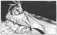 Session 12 (2/17) Hesistantly, the party opened the sarcophagus, found a strange, tall (9') gray humanoid, looking elflike or trollish - apparently the "Dragonpriest" - it was shriveled, lanky, with arms about 5 feet long, ending in sharp claws. It's eerie smile revealed sharp fangs. The party valiantly fought it, with Magnor taking serious wounds - the party had to flee across the pit (or back down the 3'tunnel) and in the process, Hildae made it across, and the half-elf and Seraphina made it to the other room. Magnor tried to jump across the pit, landing onto spikes, Sha'Oul nimbly fled into the pit and took a defensive posture. Darley fired a few magic missiles at it. The dragonpriest, Magnor, and the monk exchanged blows. Sha'Oul got a powerful kick into the midsection, stunning the troll and allowing Magnor and others to take defensive positions on the other side of the pit. While Magnor and Sha'Oul engaged in melee, Hildae and Seraphina cast spells. Seraphina's hands shot flame into the dragonpriest. Hildae whipped the leg of the monster, and tried to trip it, making it off balance. As the troll grabbed the chunky tiles with one arm to steady itself, Magnor and Sha'Oul combined to knock it into the pit, where it fell onto spikes. The party then hailed a flurry of missile weapons, including a torch, and then searched the sarcophagus. Inside were a plethora of goodies - an exquisite longbow, some arrows in a dragon bone quiver, a scroll case, a handaxe, and coins - all sheaves and sheridans. After the mayhem and search of the dragonpriest's body (revealing a ring, amulet, and a pair of thick silver dragon-shaped bracelets), the party is confronted by Meepo and the kobolds who demand the key or that the party come with them to see Yusdrayl the queen leader. A very difficult encounter ensues, as the wounded and depleted party feels deep suspicion that the kobolds are plotting something dark and sinister for them. "Should we give them the key? We are too wounded and must rest." The players attempt lying ruse after lying ruse, only to anger the kobolds further. Diplomacy fails, and the kobolds finally get the key, but only after frustration almost leads to the party's death. The kobolds growl, and reluctantly allow the party to leave unmolested. The relieved heroes return to the surface finding a piece of parchment that Aliyah and Basil have gone to Celene to return a shield of Luna and Forestthorn, the powerful staff artifact to the rulers there...