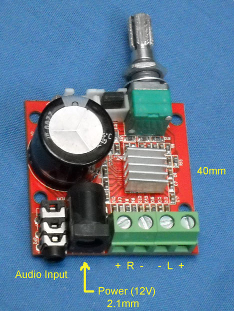 Class D, 10 watt Stereo amplifier (10 watts each channel). 12 volts.