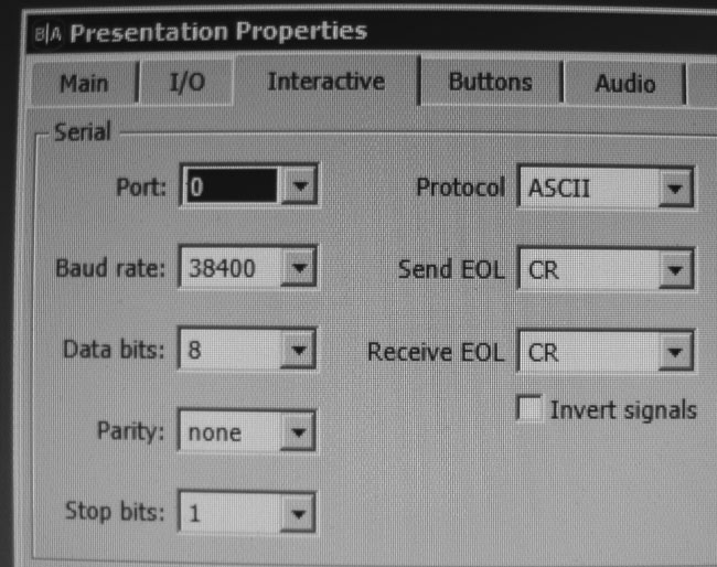 Note: On the main BrightAuthor 'pain', with 'Interactive' previously selected you will see the 'event' 'Serial Input'. Use this event to respond to a byte from the HMS board. Do not try to set the port values there (baud and so on), as the parameters that you set won't be applied. Be sure to use the command 'Serial-Send Bytes, (Comma Separated)'