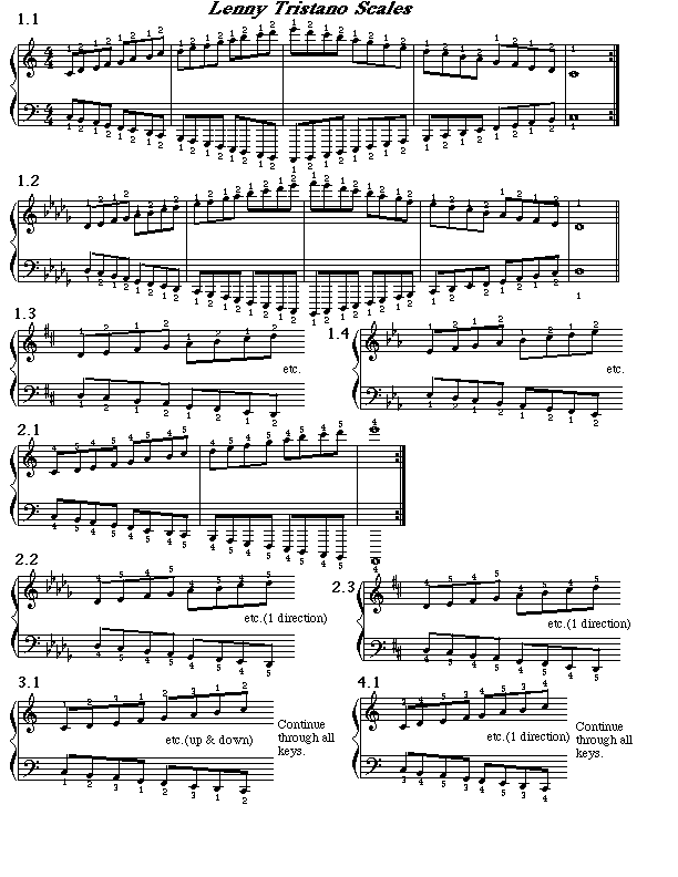 These fingerings will seem strange and uncomfortable at first, but that stage passes quickly; soon they become quite enjoyable. As shown, the 12 major scales are fingered 1212..., and then 4545...; it's a good idea to master these to a degree before going on to 123123... (ex. 3.1) and 345345... (ex. 4.1).