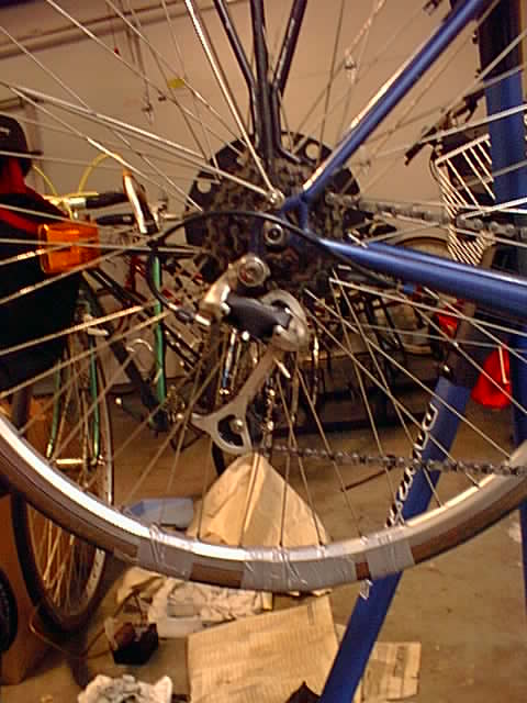 Meanwhile, John Emmel produced a huge boot cut from an old clincher that he had been given by Ken Holloway in a previous ride. The boot was placed at the most worn spot and the entire tire was lined with Duck tape. After the tire was pumped up, it bulged horribly in places. It was decided to restrain the bulging with Duck tape. Robin Morris from NASA, John Langbein of USGS, and Mr. Bill Bushnell each selected a section and wrapped multiple layers of tape around the rim and tire.