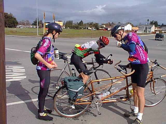 The weather continued to improve as the ride progressed. By the time the intersection of Union Road and Highway 25 was reached, there was a bit of sunshine, and it was time for some food and tandem adjustment.