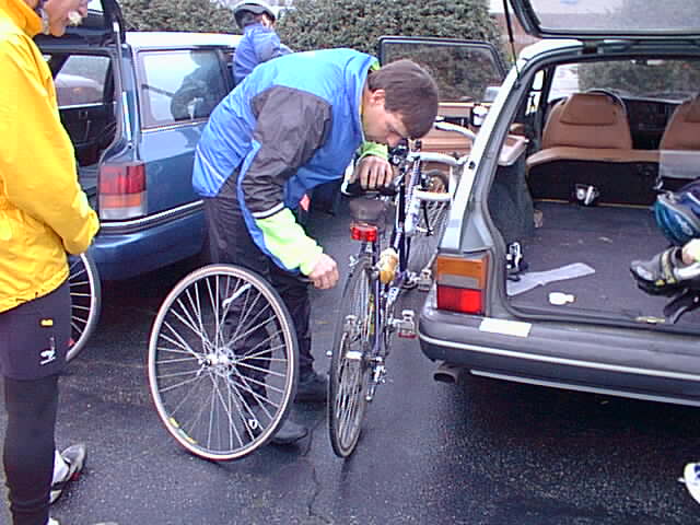 Despite the proliferation of rain gear, it was still raining at 10:20, and didn't look like it would stop soon. With no remaining excuses, Team Bikeaholics hit the road. Then they started to ride their bicycles. Almost immediately, the rain retreated in defeat. The ride soon settled into the typical routine of four abreast pacelining. There had been talk of investigating the rumored benefits of in-line pacelining, but the proliferation of rooster tails apeared to dampen any latent enthusiasm for that.