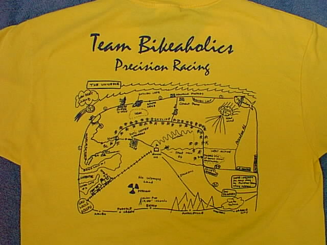 The Team Bikeaholics T-shirt made its debut at the 1997 Western Wheelers Sequoia Century lunch stop.