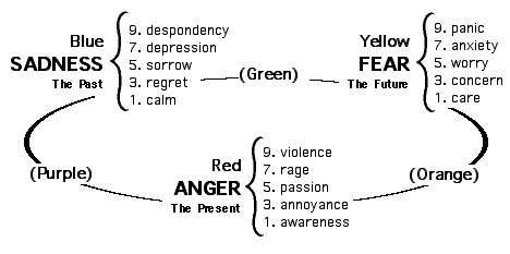 The map provided above describes feelings in terms of the color wheel, that visible spectrum of light which extends from the violet just above invisible ultraviolet to the red just beneath invisible infrared. This spectrum of color is usually mapped in a circle, with the primary colors (blue, yellow and red) located at regular intervals, and all the other colors falling somewhere in between.