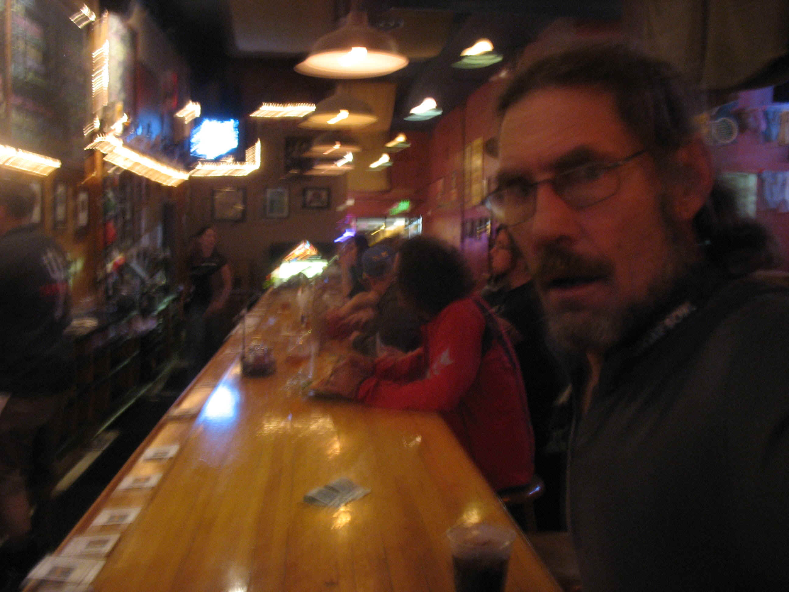 The sprint to the finish paid off. It was 12:40 when the lunatistas arrived at the brewpub. After several pitchers of RR's finest the event drew to a near close. The riders were about to leave when a stranger approached. He mentioned mountain biking and soon discovered he was in the company of the (in his mind) legendary Bikin' Fools. It turns out he was a fan. This was a first for the moonrides. He insisted on buying the group another pitcher.