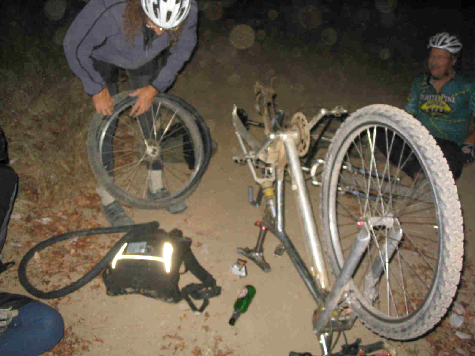 At some point in the evening, Sebastian noticed a leak in his tire. By the time the ride was over, at least five flats occurred. Somewhere along the trail was a prime patch of Goat Head thorns. They managed to find fat tires to flatten. It wasn't all bad. It required the 'fools to linger in prime country just a little longer. The serenity of the evening and the natural beauty of the moonlit night made it easy to spend time there.