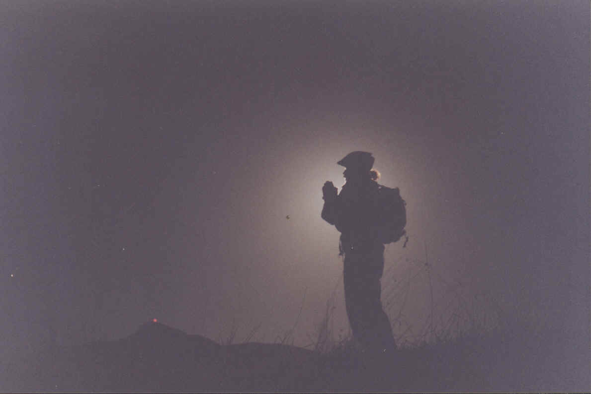 Twenty thousand dollars of bikes and ten riders pack Dr. J's van At the shop several groups of riders milled about. The VAN stood at the terminal receiving bikes and gear as the riders arrived. Before the evening was over, the van would pack a record ten riders and ten bikes for the climb up Ida Clayton road. Daniel and his Tevas showed up for another romp with the bikin' fools. The rookie for the evening was David, roommate to Matt from PMS. Buddy Holly was on hand dressed up like Jim Korte. Michel made another marriage/career-threatening appearance. His double life includes a believable career as a teacher with monthly sorties to join the lunatistas for a raid on normalcy, the mundane and ordinary life. He becomes an agent for the secret society that takes to the wilderness and becomes wild, crazy and lunatic. It was dark when Eric arrived at the shop. "Has anyone heard from Auriah. I tried calling him earlier?" "Yes." Auriah said. "Far out, dude," Eric said. "How about Large?" "Ahh, he called and said he had to pay his domestic fun tax." "O " "What are we waiting for?" "Tony," Jim said, "Hes on his way." "I stopped by his house and he wasnt even home yet." Eric said. "Lets go wait at his place." "What time is it?" Lindsey asked. "Does anyone want anything from the store?" Daniel asked. "How about some ice cream." Shawn joked. It would seem obvious that ice cream would melt quickly. Daniel and David headed off to the store, buying more time for Tone who was doing a NASCAR imitation on the Silverado Trail trying to make it to this event. Lindsey was pacing nervously. He didnt want to drive straight to the airplane from the bike ride, a situation with some precedence. Tone finally made his appearance. Three vehicles drove out of town to the bottom of Ida Clayton. There everyone loaded into Mikes van. Ten large adults would add about one ton to the vehicle. Ten bikes added another two hundred and fifty pounds. Packs and beer accounted for several more hundreds of pounds of bikin madness. The van appeared to offer no resistance in carting the giddy, glory-bound crew to the start of this months ride. On the way up the hill two items made it into the memory cells. First the appearance of tail lights up the road. They seemed strangely oriented from a distance. Eventually it became obvious that it was a bike. A roadie had chosen a parallel venue to bask in the experience that so few have known. It was cool to see another bikin' fool doing something daring, unique and difficult.