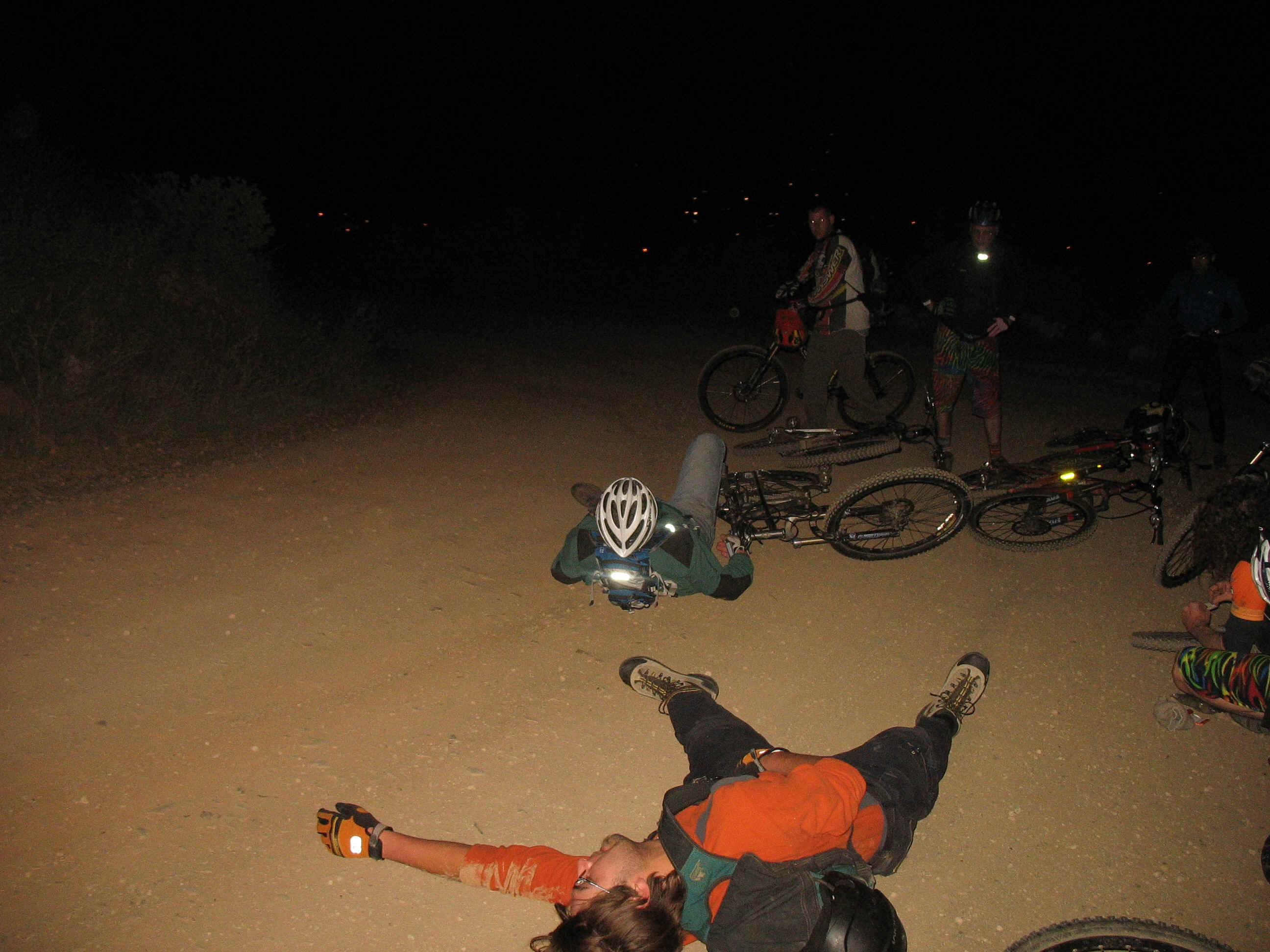 The energy for the evening was decidedly quiet, though fun none-the-less. The moonage mission provides a baseline of enjoyment regardless of the conditions. La Luna gives a special dispensation for the occasional convergence of boredom and a moonride. Matt and Dan split early and wouldnt be seen until the end of the ride. At one point, no one was certain that they even came on the ride. But later they would be the saving heros of the event with the application of a blazing, but ill advised fire. They climbed the hill so fast their wait in the cold night near the top would be lengthy. To survive they built a raging fire to keep warm. It proved to be the most popular feature of the ride.