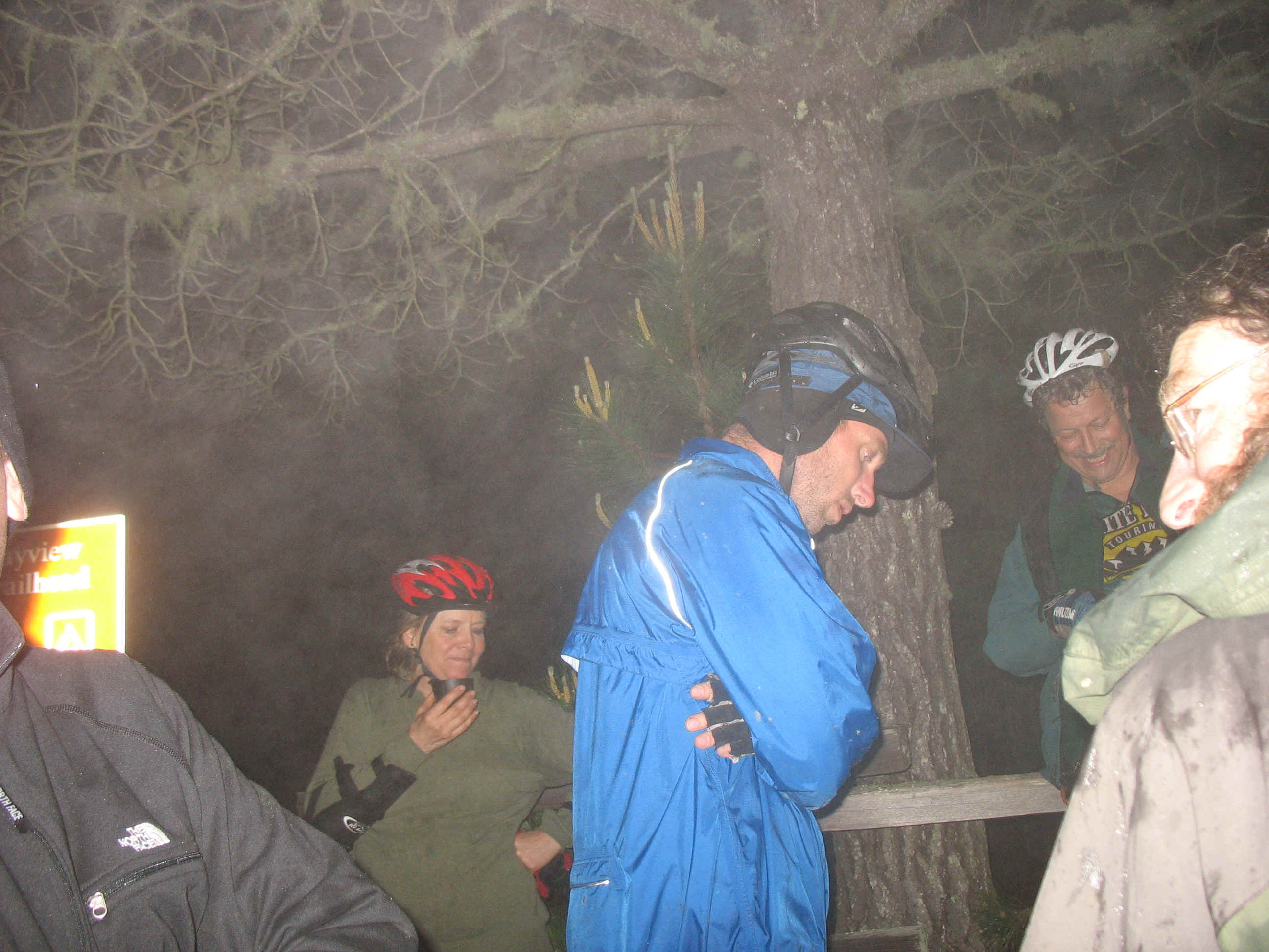 As the riders who were not first arrived at the parking lot along Limantour road, they were greeted with a most welcome sight. The first of the pack had started another fire, knowing it would be a while before all were present and accounted for. The fire, which was comprised solely of pine needles, offered a blessed relief from the wet and cool night. Eventually the whole group was again reunited.